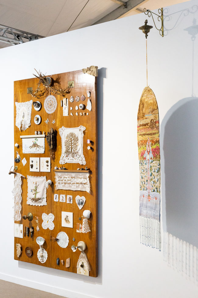 Estande da Galeria Christal, na ArtRio 2025, apresentando as obras de Marcella Vasconcelos, Thaes Arruda e Nita Monteiro. Nas obras de Nita Monteiro, o ambiente doméstico é deslocado de sua função habitual para se tornar matéria simbólica e visual. Panos, lenços e objetos evocam uma relação de intimidade com a estrutura arquitetônica e subjetiva da casa. Em sua instalação mais recente, que começa no chão e ascende à parede, duas portas de antigos armários da casa da artista Judith Lauand recebem bordados, peças porcelana, cacos e pedaços de madeira, tesouros encontrados que se tornam relíquias arqueológicas do lar. Ali se manifesta o ciclo da vida, um movimento de constante renovação e circularidade. A casa se torna a própria superfície liminar, o lugar onde o cotidiano se transmuta em signo. Os materiais de Nita operam como vestígios, marcadores de presença e ausência, acionando camadas do vivido e do coletivo.