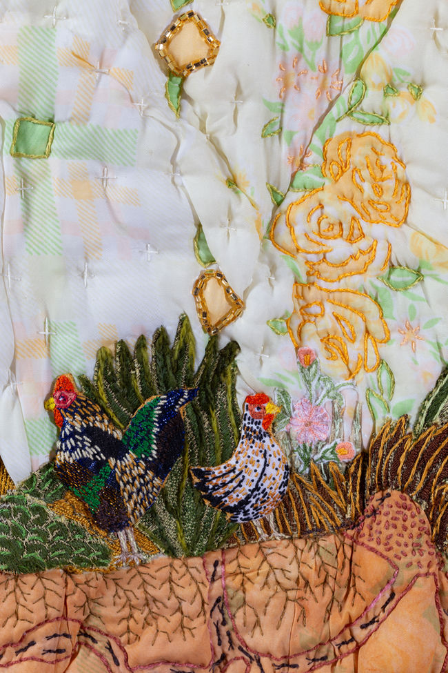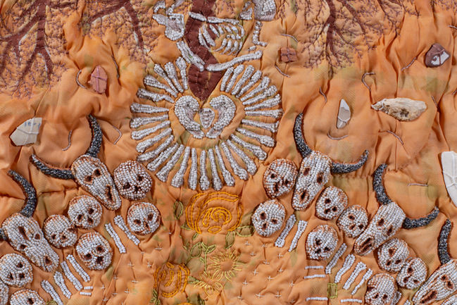 Tecidos variados, partes de uma cortina, miçangas, fragmentos de cerâmicas e conchas coletados em diversos lugares, bordados e pintura com barro sobre colcha usada.